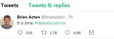 यस्तोमा वाट्सएपका संस्थापक ब्रायन एक्सनले फेसबुक डिलिट गर्न आह्वान गरेका छन् । सन् २०१४ मा ब्रेनले आफ्नो कम्पनी वाट्सएपनै फेसबुकलाई १६ अर्ब अमेरिकी डलरमा बिक्री गरेका छन् ।