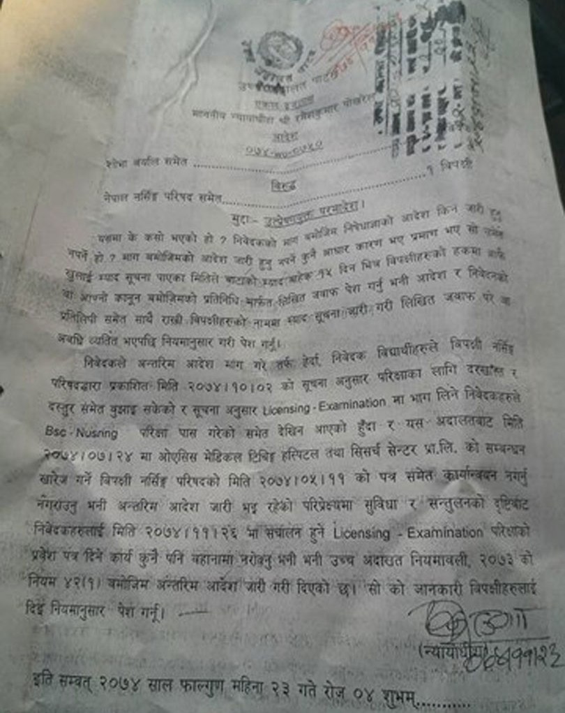 उच्च अदालत पाटनले विद्यार्थीलाई लाइसेन्स परीक्षामा सहभागी गराउन नेपाल नर्सिङ परिषद्लाई फागुन २३ गते आदेश दिएको थियो ।