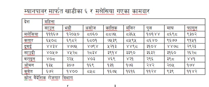हामीले गत साउनदेखि फागुनसम्म मलेशिया र खाडी मुलुक जाने कामदारको विवरण पनि दिएका छौं । यो संख्या आफै हेर्नसक्नुहुन्छ । यो संख्यामा सरकारले भने अनुसार प्रतिकामदार १० हजार रुपैयाँ लिएको भनेर बैदेशिक रोजगार ब्यवसायीले आफ्नो कारोबार विवरण कर कार्यालय सहित सरोकारवाला निकायमा बुझाउनु पर्छ ।