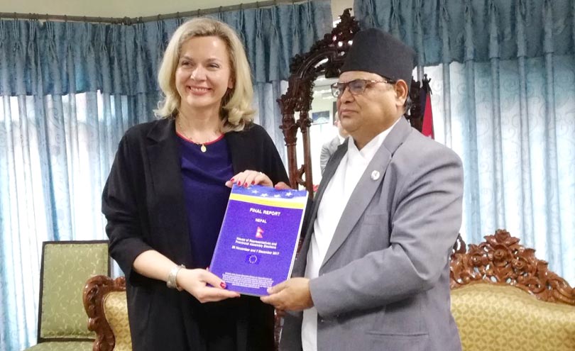 काठमामडौँ । यूरोपेली संघले प्रतिनिधिसभा र प्रदेशसभा निर्वाचनका क्रममा गरेको अनुगमनको प्रतिवेदन सभामुख कृष्णबहादुर महरालाई चैत ५ गते सभामुखको कार्यकक्षमा बुुझायो ।