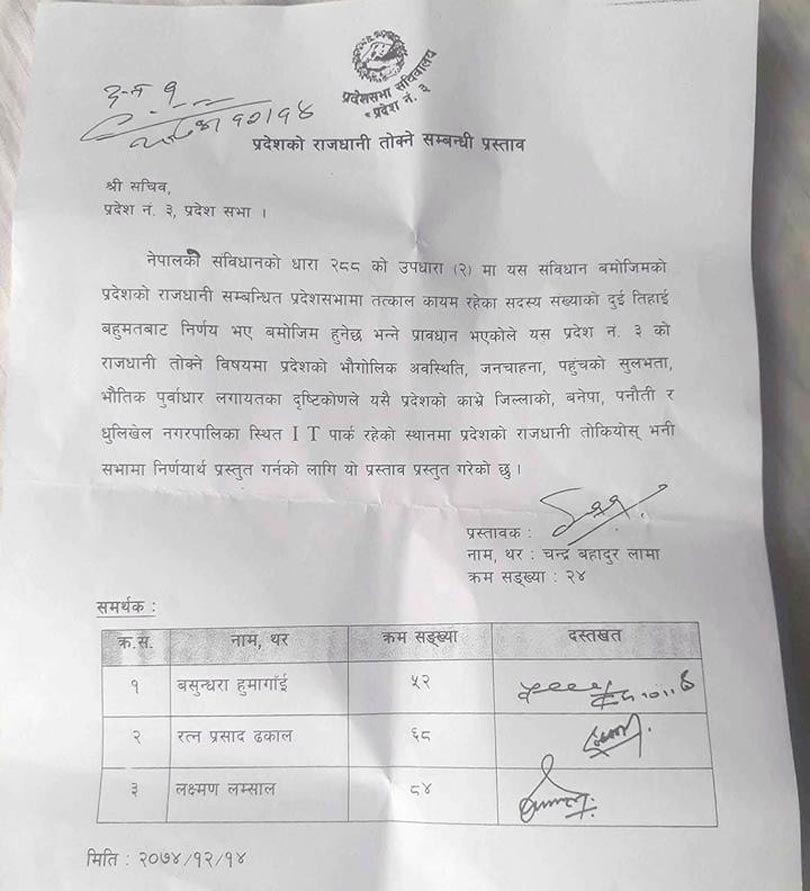 काभ्रेका प्रदेश सांसद चन्द्रबहादुर लामा प्रस्तावक रहेको र वसुन्धरा हुमागाई, रत्नप्रसाद ढकाल र लक्षम लम्साल समर्थक रहेको प्रस्ताव यही चैत १४ गते प्रदेश संसद सचिवालयमा दर्ता भएको छ । उनीहरुले भौतिक पूर्वाधारको दृष्टिले आइटी पार्क नै प्रदेश राजधानीका लागि उपयुक्त रहेको दावी गरिएको छ ।