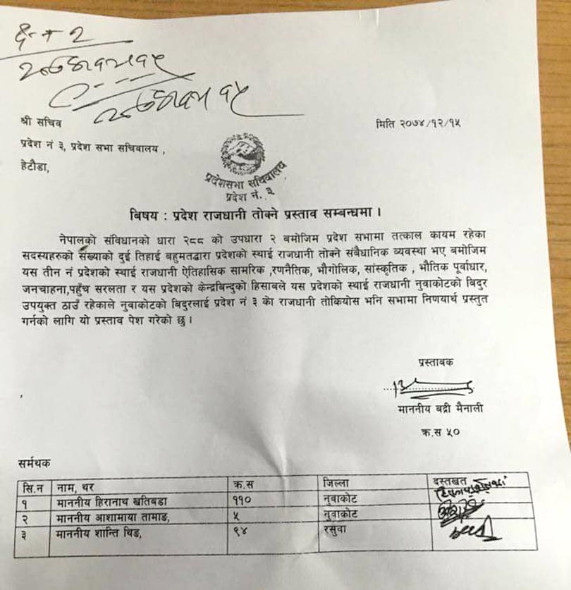 यस्तै नेपालको स्रविधानको धारा २८८ को उपधारा २ बमोजिम प्रदेशसभाका तत्काल कायम रहेका सदस्यको दुई तिहाई बहुमतबाट प्रदेशको राजधानी तोक्ने संवैधानिक अधिकार रहेको भन्दै नुवाकोटका प्रदेशसभा सदस्य बद्री मैनाली प्रस्तावक रहेको र हिरानाथ खतिवडा, आशामाया तामाङ र शान्ति थिङ सर्मथक रहेको नुवाकोटको विदुर नै राजधानी उपयुक्त रहेको प्रस्ताव समेत दर्ता भएको छ ।