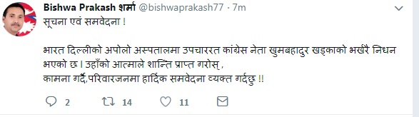 नेपाली कांग्रेसका प्रवक्ता विश्वप्रकाश शर्माले ट्वीट गर्दै यसको जानकारी दिए ।