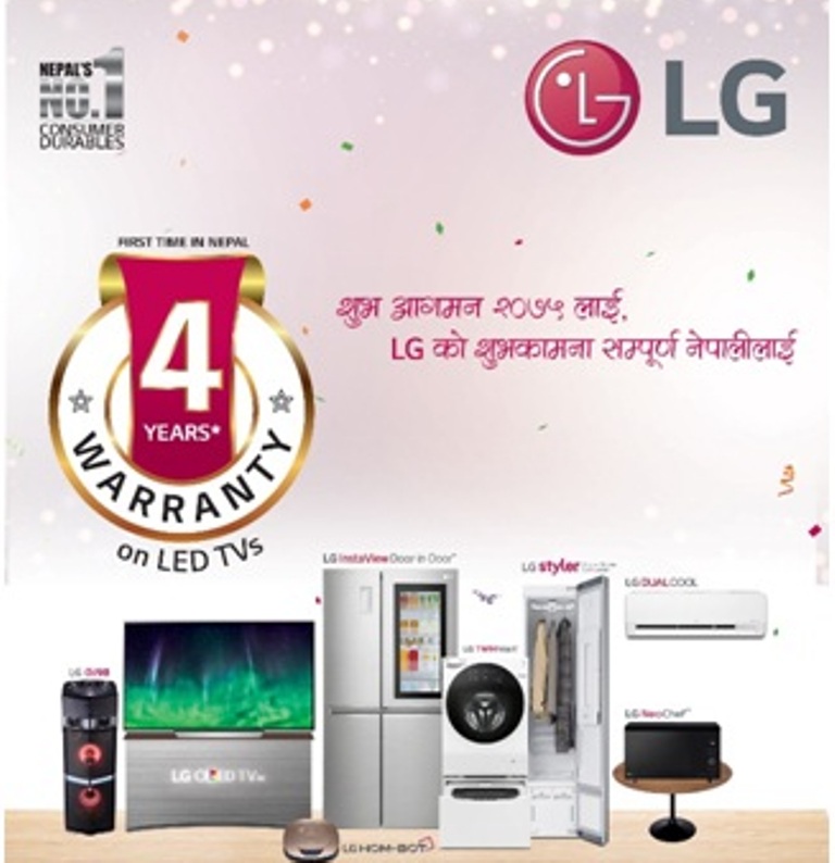 एलजी होम इन्टरटेनमेन्ट अफर अन्तर्गत ४ वर्षे वारेन्टी ३० प्रतिशत सँगै ५५ इन्चभन्दा माथिको एलइडी सुपरएचडी टिभीको खरिदमा एलएच ६४ होम अडियो प्राप्त गर्न सकिने छ । सार्थ नर्भर र स्मार्ट टिभीको खरिदमा ४ वर्षको वारेण्टी प्राप्तगर्न सकिनेछ ।