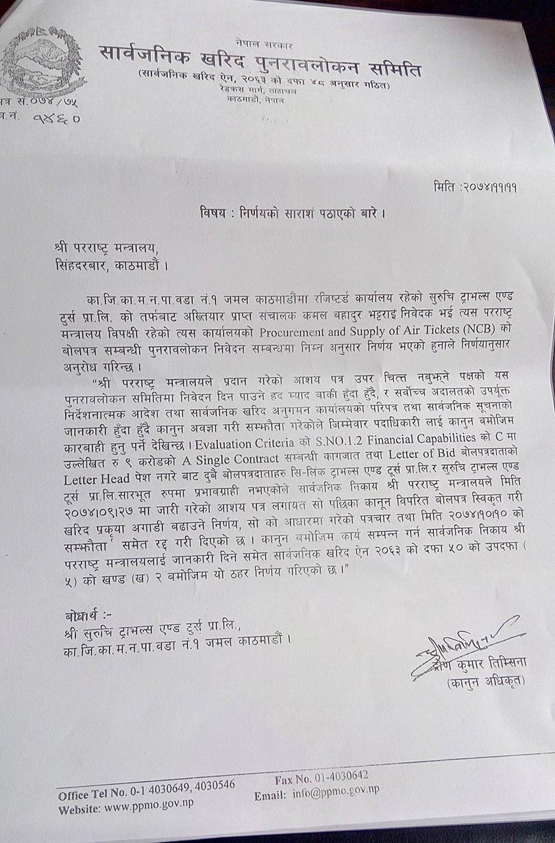 ‘श्री परराष्ट्र मन्त्रालयले प्रदान गरेको आशयपत्र उपर चित्त नबुझ्ने पक्षको यस पुनराबलोकन समितिमा निवेदन दिन पाउने हद म्याद बाँकी हुदाँहुदै र सर्बाेच्च अदालतको उपर्युक्त निर्देशनात्मक आदेश तथा सार्बजनिक खरिद अनुगमन कार्यालयको परिपत्र तथा सार्बजनिक सुचनाको जानकारी हुँदाहुँदै कानुन अवज्ञा गरी सम्झौता गरेकोले जिम्मेवार पदाधिकारीलाई कानुन बमोजिम कारबाही हुनुपर्ने देखिन्छ,’ समितिले फागुन ११ गते मन्त्रालयलाई लेखेको पत्रमा उल्लेख छ ।