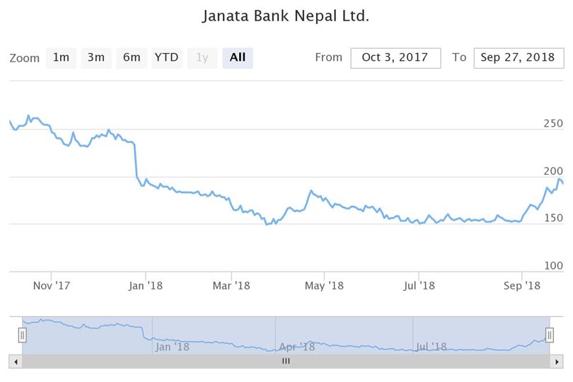 भदौं १० गते आईतबार दोस्रो बजारमा प्रतिकित्ता १ सय ५३ रुपैयाँ रहेको जनता बैंकको सेयर अहिले १ सय ९२ रुपैँया पुगेको छ । जनताको सेयर मूल्य ३९ रुपैयाँले बढ्न पुगेको हो । यसरी नै भदौं ३१ गते सो बैंकको सेयर मूल्य १ सय ८८ रुपैयाँ थियो ।