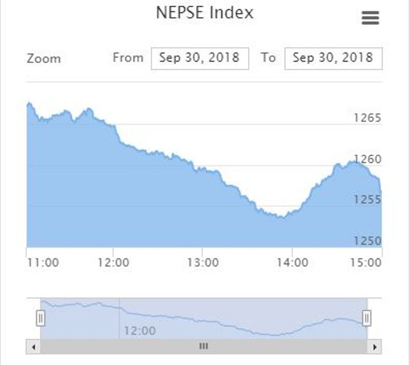 काठमाडौं । साताको पहिलो दिन आईतबार नेपाल स्टक एक्सचेन्ज (नेप्से) परिसूचक घटेको छ । नेप्से परिसूचक १०.४७ अंकले घटेको हो । ०.८३ प्रतिशतले घट्दा नेप्से परिसूचक १२५६.७१ बिन्दुमा पुगेको हो ।