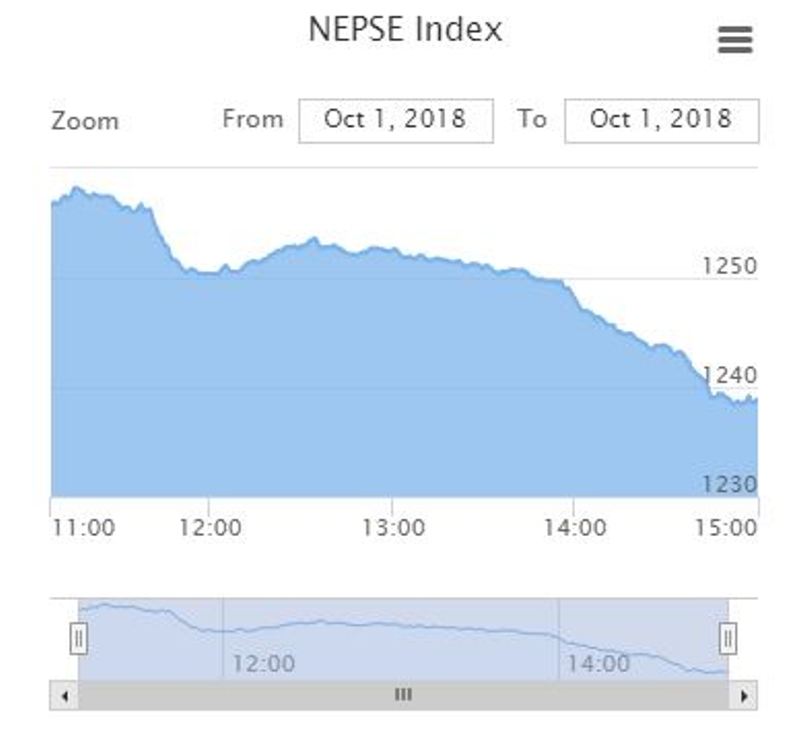 नेपाल स्टक एक्सचेन्जका अनुसार आज नेप्से परिसूचक १८.०४ अंकले घटेको छ । १.४४ प्रतिशतले घट्दा नेप्से परिसूचक १२३८.६७ बिन्दुमा पुगेको हो ।