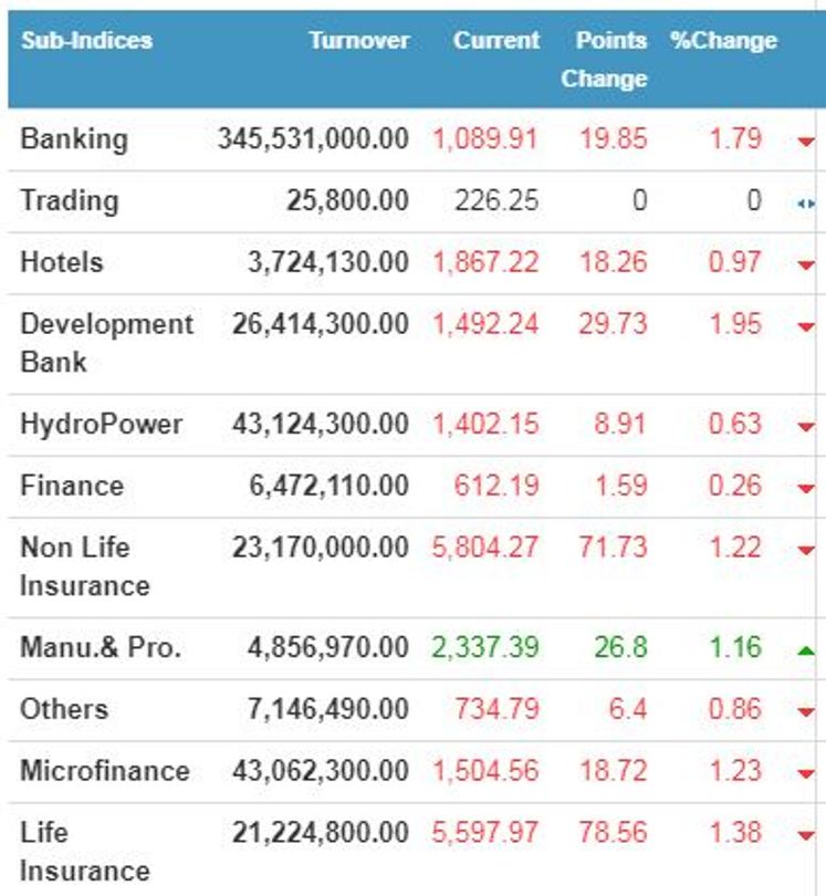 यस्तै बैंक १९.८५, होटल १८.२६, विकास बैंक २९.७३, जलविद्युत ८.९१ वित्तीय १.५९, निर्जीवन बीमा ७१.७३ , अन्य ६.४, माईक्रोफाइनान्स १८.७२ र जीवन बीमा ७८.५६ अंकले घटेका छन् ।