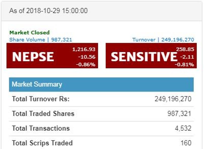 नेपाल स्टक एक्सचेञ्ज(नेप्से)का अनुसार समग्रमा २४ करोड ९१ लाख ९६ हजार रुपैयाँ बराबरको कारोबार भएको छ । हिजो आइतबार समग्रमा ३२ करोड ६४ लाख ८३ हजार रुपैयाँ बराबरको कारोबार भएको थियो । यसरी नेप्से परिसूचकको कारोबार अघिल्लो दिनको तुलनामा आज करीब ८ करोडले घटेको हो ।
