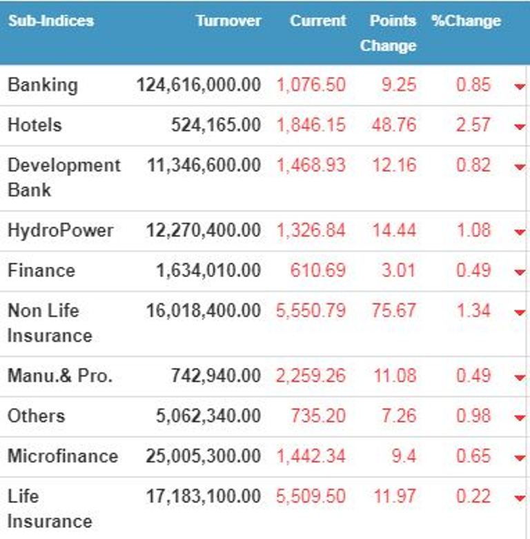 आज सबै समूह राताम्मे भएका हुन् । बैंकिङ समूह ९.२५, बिकास बैंक समूह १२.१६, वित्तीय समूह ३.०१ र माइक्रोफाइनान्स समूह ९.४ अंकले घटेका हुन् ।