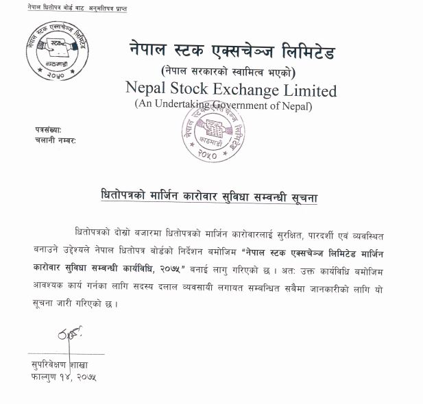 नेप्सेले मंगलबार सूचना जारी गर्दै ‘नेपाल स्टक एक्सचेन्ज मार्जिन कारोबार सुविधा सम्बन्धी कार्यविधि २०७५’ लागू भएको र उक्त कार्यविधि अनुसार काम गर्नका लगि सदस्य दलाल व्यवासायीहरुलाई आग्रह गरेको छ ।