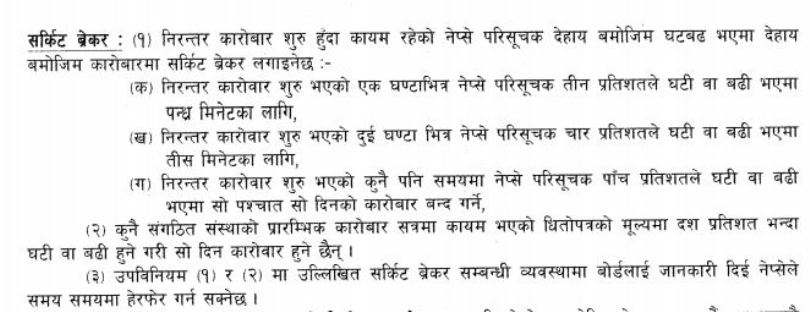 ३. उपविनियम १ को २ मा उल्लिखित सर्किट ब्रेकर सम्बन्धी व्यवस्थामा बोर्डलाई जानकारी दिई नेप्सेले समय समयमा हेरफेर गर्न सक्नेछ’ भनेर प्रष्ट लेखिएको छ ।