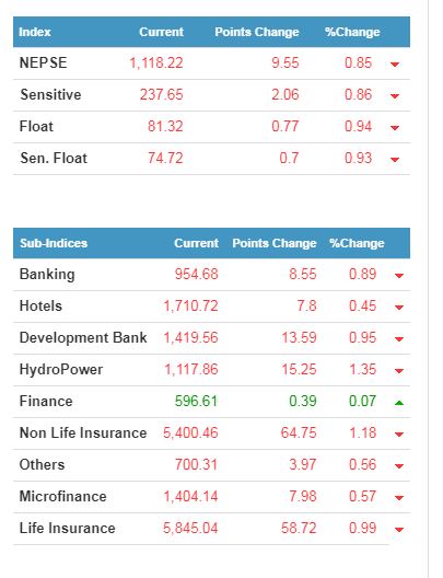 कारोबारको सुरुदेखि नै बजार ओरालो लाग्ने क्रममा देखिएको छ । नेपाल स्टक एक्सचेन्ज (नेप्से) मापन गर्ने सूचक ९.५५ अंकले घटेर १ हजार ११८.२२ बिन्दुमा पुगेको छ ।