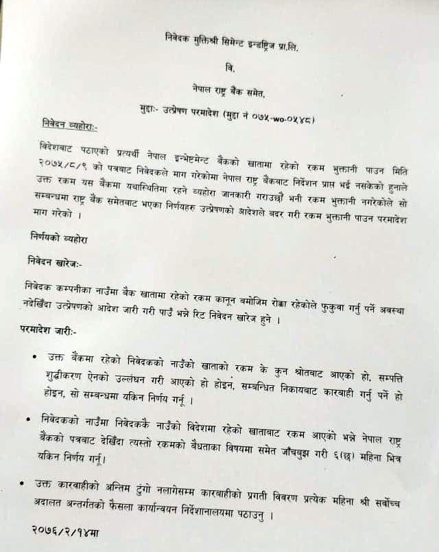 सर्बोच्चले निवेदनको माग अनुसार परमादेश जारी गरेको समाचार आएपछि सर्बोच्च अदालतले पेस्रनोट जारी गर्दै उनको रोक्का भएको रकम खुल्ला गर्न परमादेश जारी नभएको जनाएको छ ।