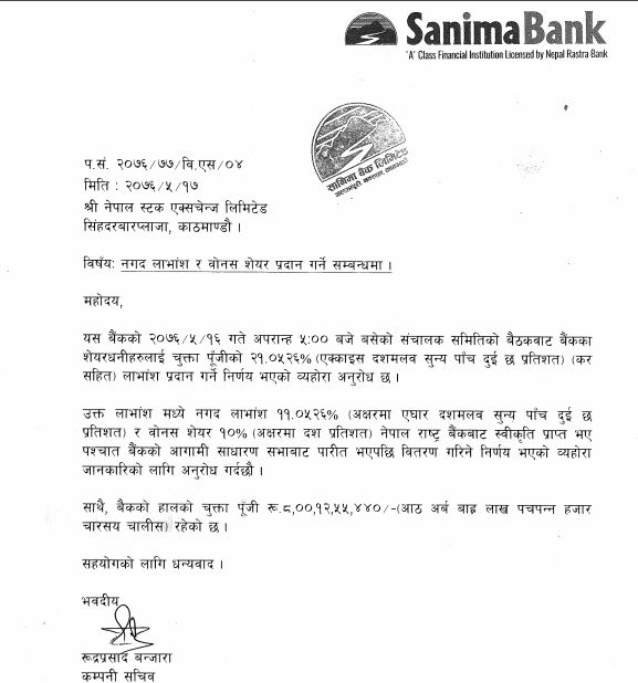 सानिमा बैंकले लगानीकर्तालाई २१ प्रतिशत लाभांश दिने