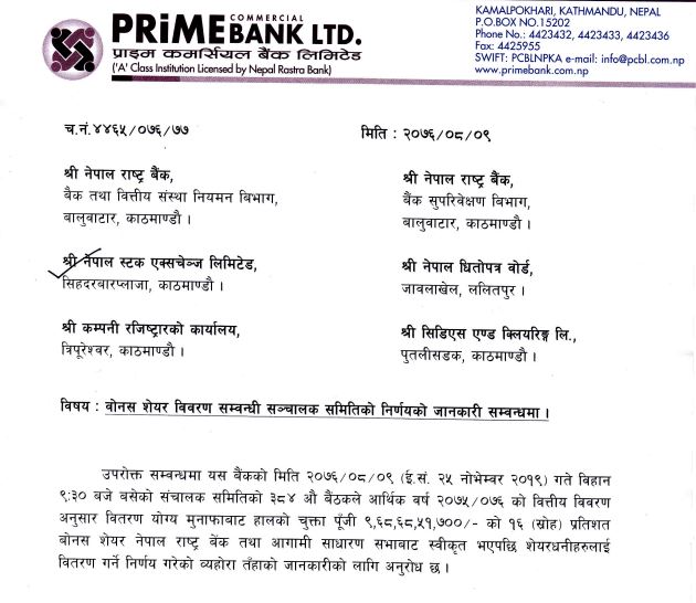 काठमाडौं । प्राइम कमर्शियल बैंकले सेयर लगानीकर्ताहरुलाई १६ प्रतिशत बोनस दिने भएको छ ।