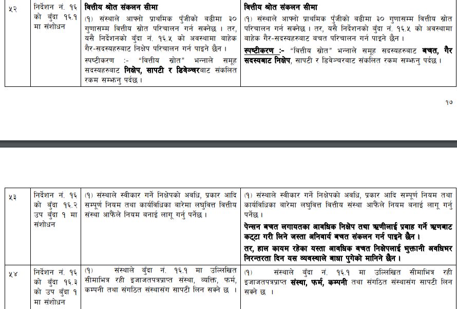 यसअघि लघुवित्त संस्थाहरुले आफ्ना सदस्यहरुबाट बचत संकलन गरी सदस्यहरुलाई मात्रै ऋण दिनुपर्थ्यो । सहकारी र लघुवित्तको इजाजत दिने संस्था फरक भएपनि प्रवृत्ति भने उस्तै थियो । तर, अब लघुवित्त संस्थाहरुले बैंकले जस्तै सर्वसाधराणबाट निक्षेप संकलन गर्न पाउने छन् ।