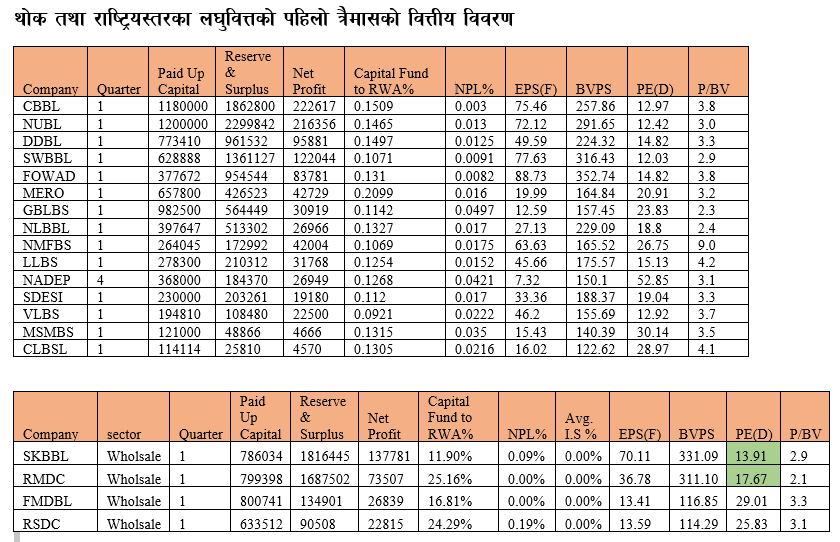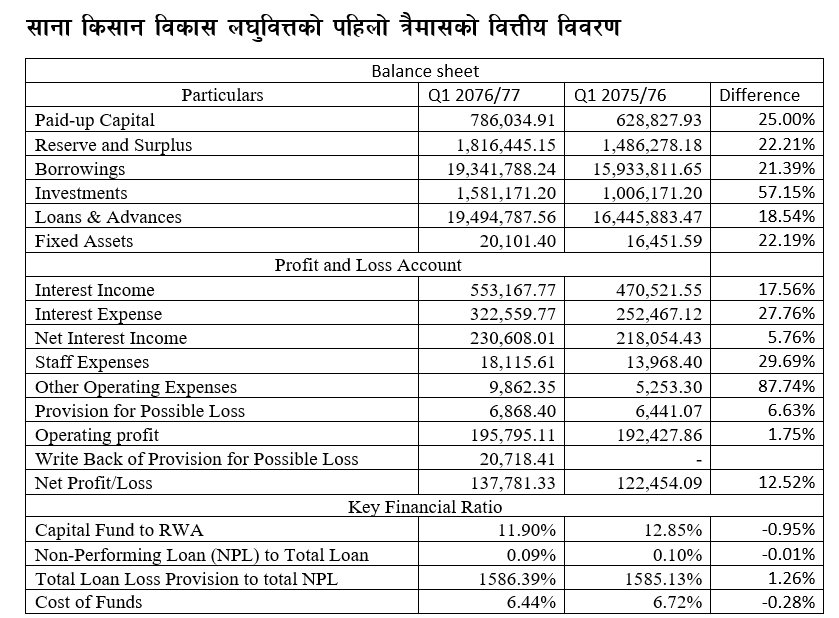 साना किसान विकास लघुवित्तको पहिलो त्रैमासको वित्तीय विवरण सामान्यमात्र प्रगति गरेको देखिन्छ । साना किसानको खुद ब्याज आम्दानीमा सुधार तथा नोक्सान व्यवस्थापन कोष मार्फत २ करोड ७ लाख रुपैयाँ फिर्ता ल्याउँदा लघुवित्तको नाफामा सुधारले मात्र नाफामा १२.५१ प्रतिशतले बढेको हो ।