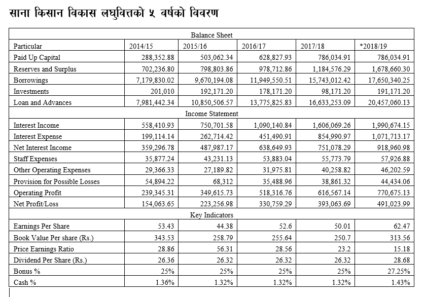 चुक्ता पुँजी वृद्धि भए अनुसार खुद नाफा बढ्न नसक्दा प्रतिसेयर आम्दानी ७ रुपैयाँ ७६ पैसाले घटेर ७० रुपैयाँ १२ पैसामा आएको छ । साना किसान लघुवित्त वित्तीय संस्था गत वर्षको नाफाबाट २७.२५ प्रतिशत बोनस शेयर र सोको कर प्रयोजनको लागि १.४३ प्रतिशत नगद लाभांश गरी कूल २८.६८ प्रतिशत लाभांश वितरण गर्ने प्रस्ताव रहेको छ । हाल ७८ करोड ६० लाख ३४ हजार ९१० रुपैयाँ चुक्ता पूँजी रहेको यस लघुवित्तको प्रस्तावित बोनस शेयर वितरणपश्चात एक अर्ब एक करोड २९ लाख ५४ हजार ४४३ रुपैयाँ पूँजी कायम हुनेछ ।