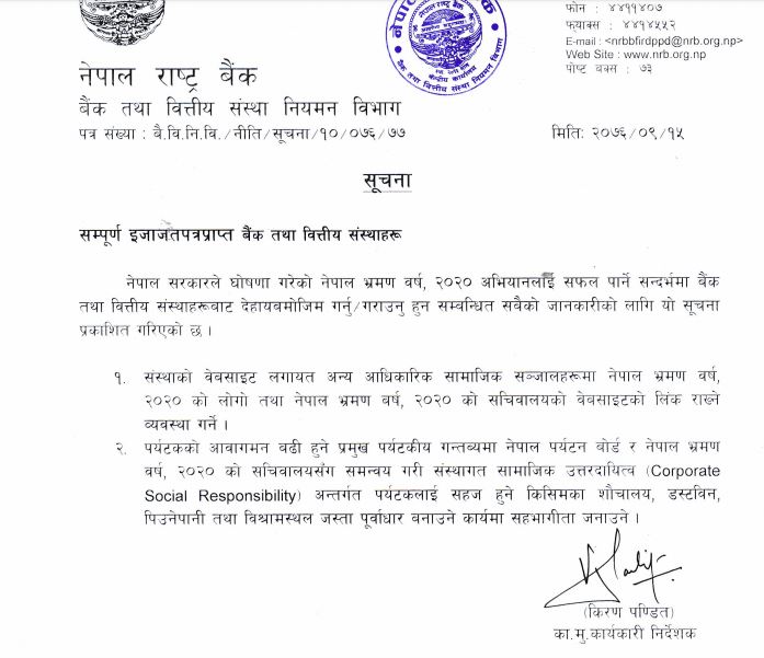 राष्ट्र बैंकले बैंक तथा वित्तीय संस्थालाई संस्थाको वेवसाइट लगायत आधिकारिक सामाजिक सञ्जालमा नेपाल भ्रमण वर्ष २०२० को लोगो र भ्रमण वर्ष सचिवालयको वेवसाइटलाई समावेश गराउन गराउन निर्देशन दिएको छ ।