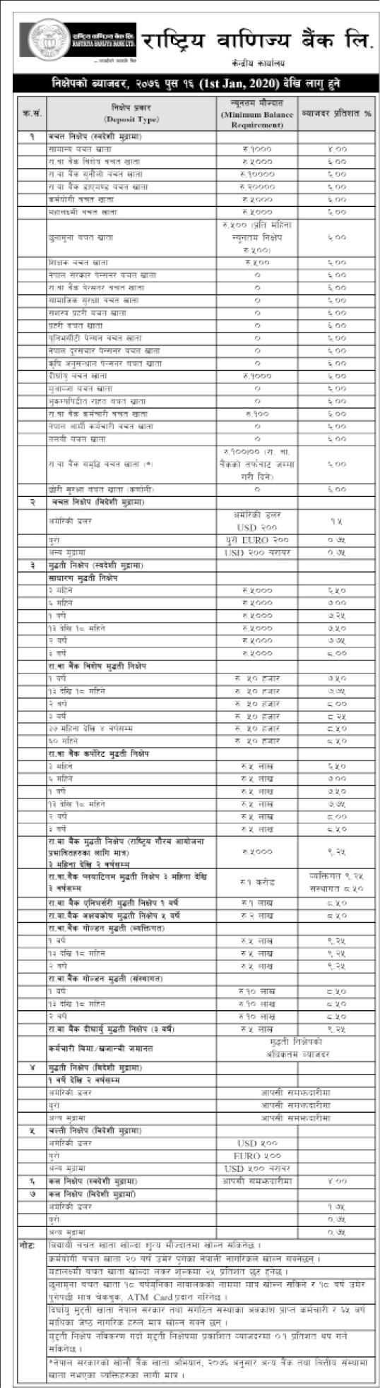 काठमाडौं । राष्ट्रिय वाणिज्य बैंकले नयाँ ब्याजदर सार्वजनिक गरेको छ । बैंकले सार्वजनिक गरेको नयाँ ब्याजदरमा मुद्दतिमा व्यक्तिगत तर्फ ९.२५ र संस्थागत रुपमा ८.५० प्रतिशत रहेको छ ।