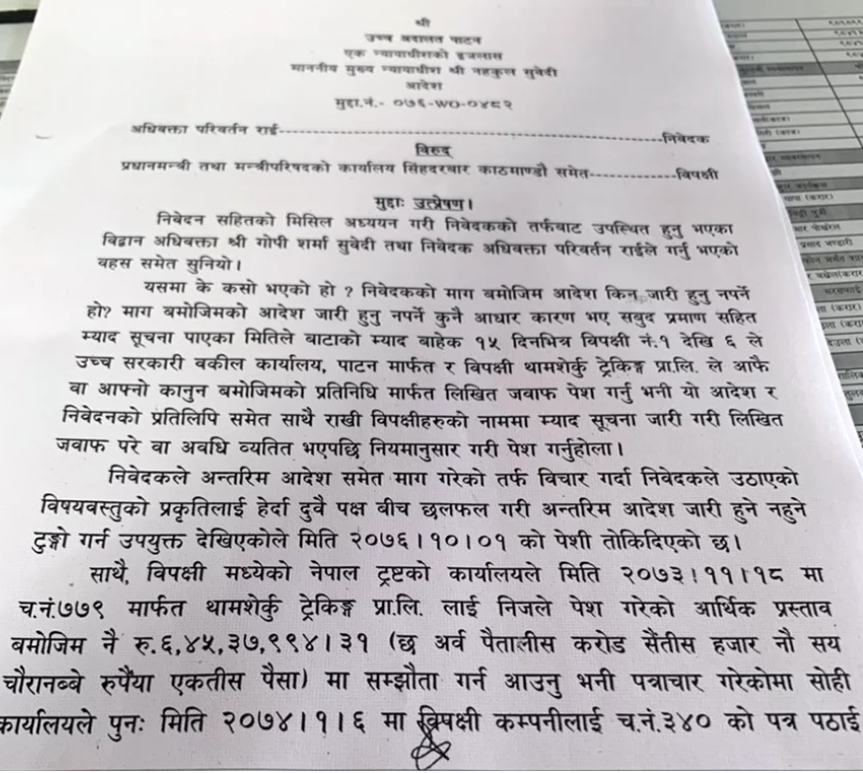 नेपाल ट्रस्टले यती समूहसँग गरेको सम्झौता त्रुटिपूर्ण रहेको भन्दै परेको रिटमा उच्च अदालतका मुख्य न्यायाधीश नहकुल सुवेदीको एकल इजलासले यस्तो आदेश दिएको हो ।