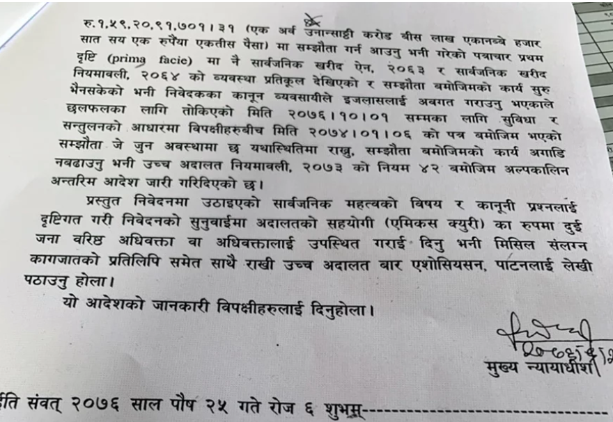 अदालतले यो सम्झौता यथास्थितिमा राख्न र सम्झौताअनुसारको काम अगाडि नबढाउन अन्तरिम आदेश दिएको छ । र, दुवै पक्षलाई १ माघमा छलफलका लागि उपस्थित हुन आदेश दिएको छ ।