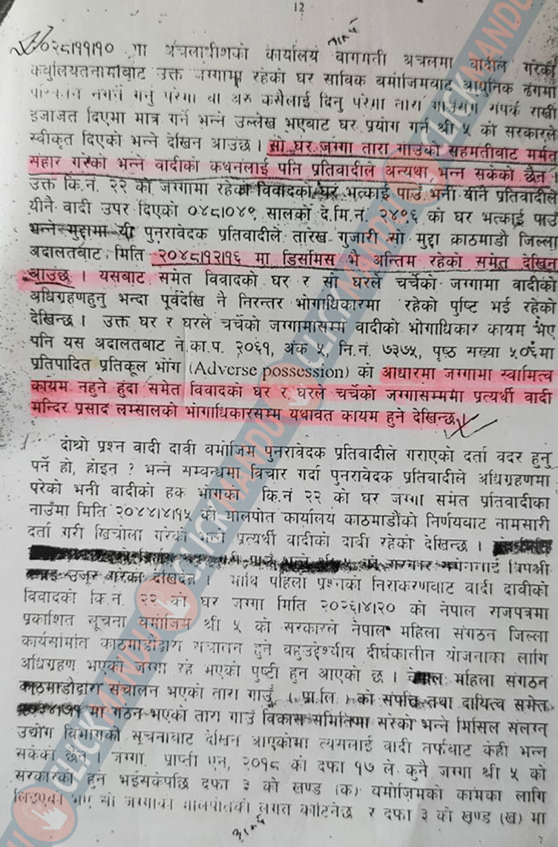तर, मन्दिरप्रसाद लम्सालको भने एक दशकअघि नै मृत्यु भइसकेको छ । लम्सालको मृत्युसँगै उनको भोगाधिकार समाप्त भएको हो । उनकी श्रीमती जयन्ती लम्सालले २०६७ सालमा ज्वाई जीवनकुमार आचार्यलाई त्यो जग्गा र घरको समस्या हेर्ने गरी वारिसनामा दिएकी छिन् ।
