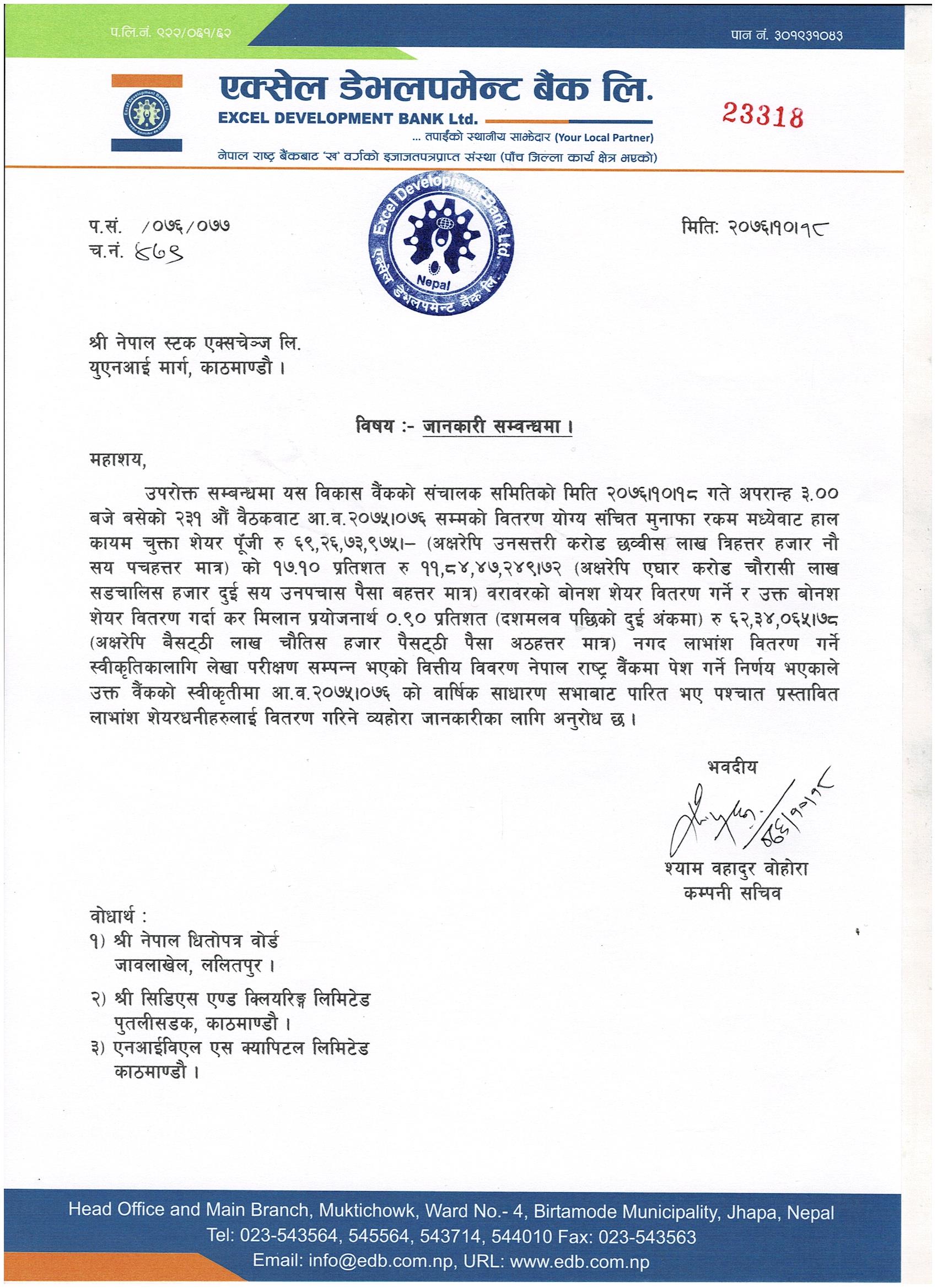 उक्त लाभांश राष्ट्र बैंकबाट स्वीकृत भएर आगामी साधारणसभाले पारित गरेपछि सेयरधनीमा वितरण गरिने बैंकले जनाएको छ ।