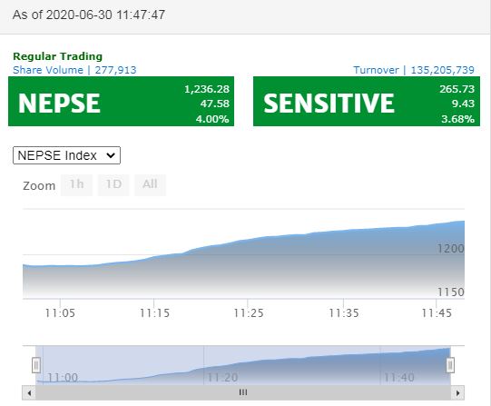 काठमाडौं । तीन महिनापछि खुलेको बजारमा दोस्रो दिन उल्लासमय कारोबार भएको छ । मंगलबार कारोबार शुरु भएको ४८औं मिनेटमा बजारमा ४ प्रतिशतको सकारात्मक सर्किट लागेको छ ।