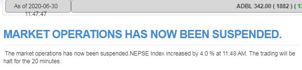 योसँगै बजार २० मिनेटका लागि बन्द हुनेछ । यो समाचार तयार पार्दासम्म ११६ कम्पनीको २ लाख ७७ हजार ९१३ कित्ता सेयर १३ करोड ५२ लाख ५ हजार ७३९ रुपैयाँको सेयर कारोबार भएको छ।