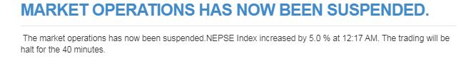 कारोबार सुरु भएको १ घन्टा १७ मिनेटमा दोस्रो बजार सर्किट लागेर बजार ४० मिनेटको लागि बन्द भएको हो ।
