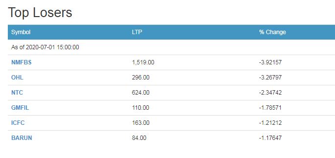 बुधबारको कारोबारमा गुमाउनेमा नेशनल माइक्रोफाइनान्स, ओरियन्टल होटल, नेपाल दुरसञ्चार कम्पनी, गुहेश्वरी मर्चेन्ट बैंक एण्ड फाइनान्स, आईसीएफसी फाइनान्स, बरुण हाईड्रोपावर कम्पनीका लगानीकर्ताले गुमाएका छन् ।