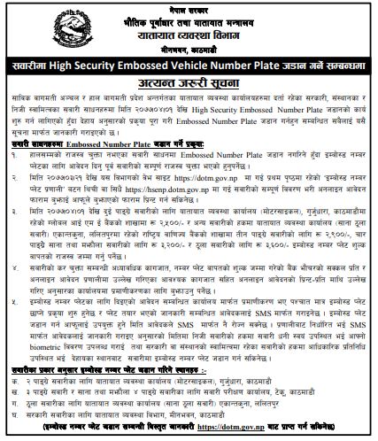 इतबार एक सूचना जारी गर्दै विभागले आगामी साउन १ गतेदेखि इम्बोस्ड नम्बर प्लेट जडान गरिने जानकारी दिएको छ ।