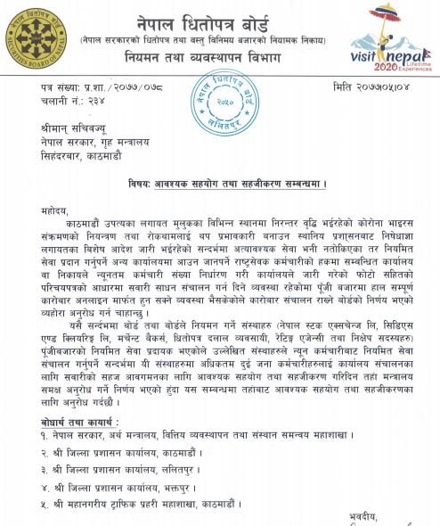 बोर्डले मन्त्रालयलाई पत्र लेखेर नेपाल बोर्डले नियमन गर्ने संस्थाहरु पुँजी बजारको नियमीत सेवा प्रदायक भएकोले ती संस्थाहरुले न्युन कर्मचारीबाट नियमित सेवा सञ्चालन गर्नुपर्ने भएकोले ती सस्थाहरुमा अधिकतम २ जना कर्मचारी कार्यालय सञ्चालनका लागि सवारीको सह आवमगनको लागि सहयाग गर्न आग्रह गरेको छ ।