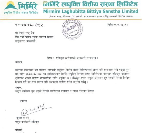 दुवै संस्था एक भएपछि मिर्मिरे लघुवित्त वित्तीय संस्थाको नामबाट एकीकृत कारोबार सुरु भएको हो ।