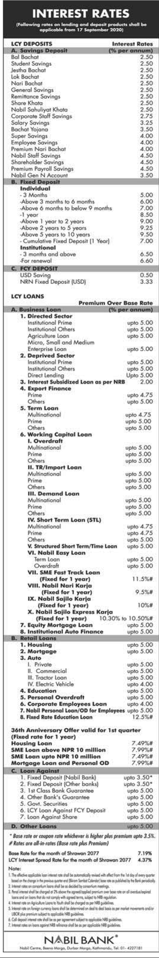 त्यसैगरी बैंकले एक वर्षका लागि एसएमई फास्ट ट्रयाक लोनमा फिक्स्ड ११.५ प्रतिशत, बलि नारी कर्जामा एक वर्षका लागि फिक्स्ड ९.५ प्रतिशत, नबिल सजिलो कर्जातर्फ एक वर्षका लागि फिक्स्ड १० प्रतिशत ब्याजदर तोकेको छ ।