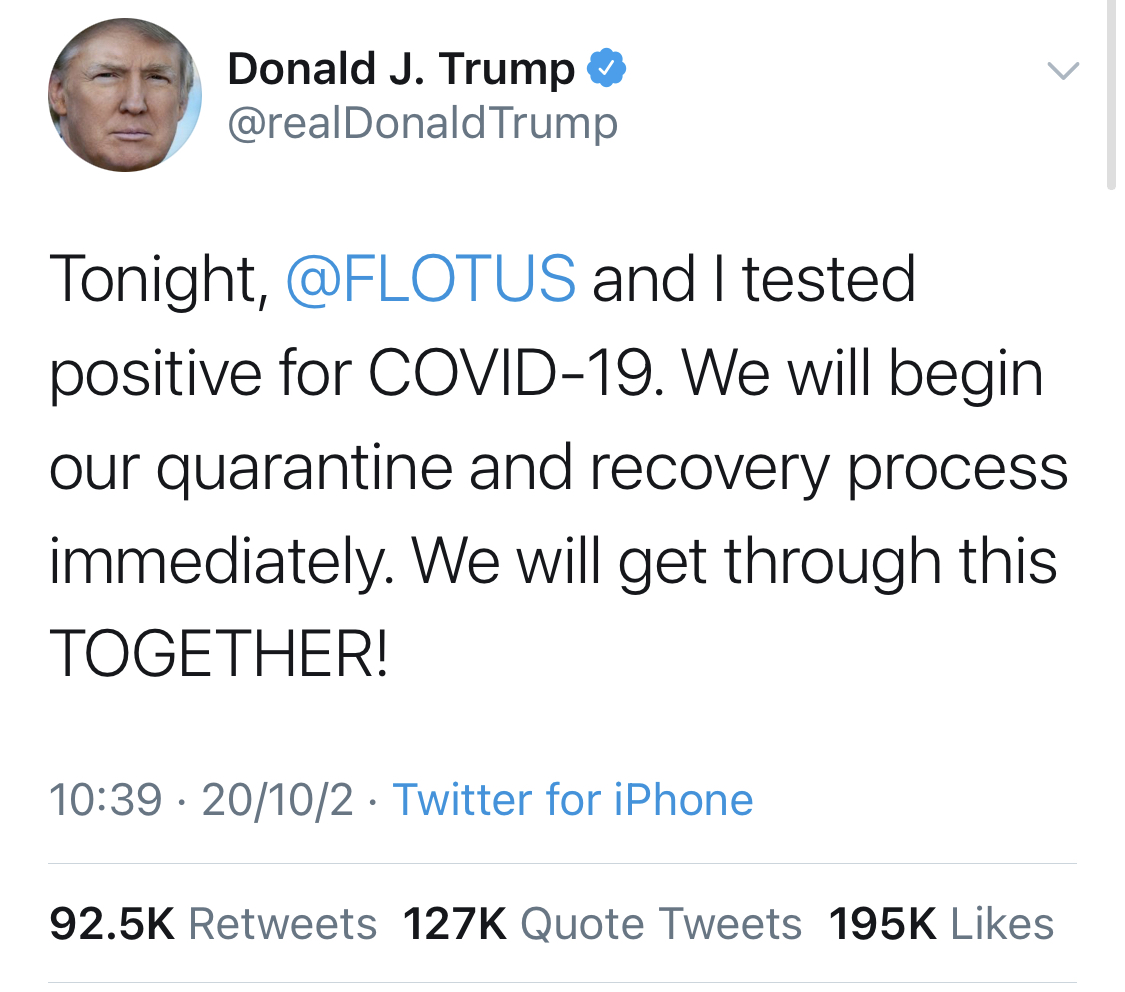 अमेरिकी राष्ट्रपति डोनाल्ड ट्रम्पलाई कोरोना भाइरस संक्रमण पुष्टि भएको छ ।
