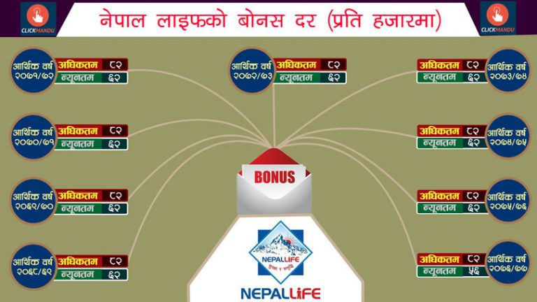 कम्पनीले सो आर्थिक वर्षका लागि बीमितलाई बीमा अवधिअनुसार प्रतिहजार न्यूनतम ६३ रुपैयाँदेखि अधिकतम ८५ रुपैयाँसम्म बोनस दर दिने घोषणा गरेको छ । तर, नेपाल लाइफले बीमा अवधिअनुसार प्रतिहजार न्यूनतम ५६ रुपैयाँदेखि अधिकतम ८२ रुपैयाँ बोनस दर कायम गरेको छ ।
