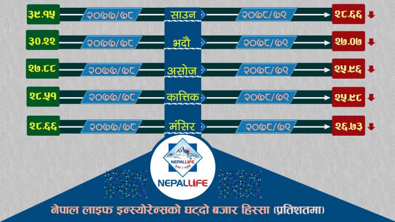 यस्तै, कात्तिक र मंसिर महिनामा पनि कम्पनीको बजार हिस्सा गुम्दै गएको तथ्यांकले देखाउँछ । कात्तिक महिनामा कम्पनीले कुल जीवन बीमा व्यवसायमा २५.९८ प्रतिशत हिस्सा ओगटेको थियो । जुन गत आवको कात्र्तिक महिनाको तुलनामा २.५३ प्रतिशत विन्दुले घटेको हो ।