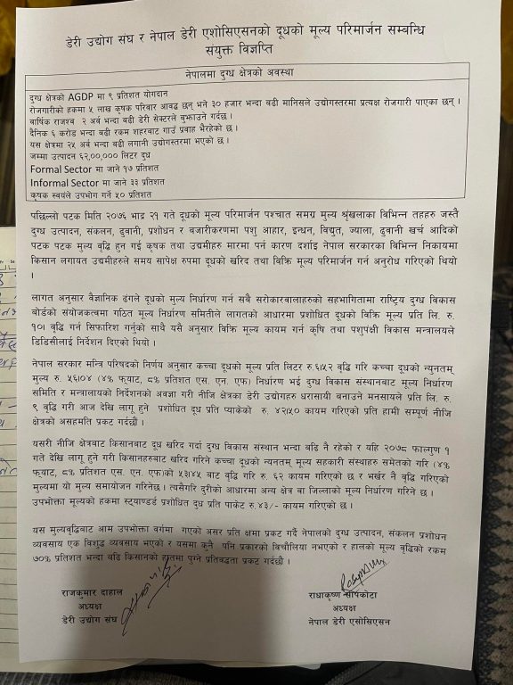 दुवै संघले राजधानीमा पत्रकार सम्मेलन गरेर दूधको मूल्य बढेको प्रति असहमति जनाएको हो । ‘मन्त्रिपरिषदको निर्णय अनुसार कच्चा दूधको मल्य प्रति लिटर ६.५२ रुपैयाँ वृद्धि गरि कच्चा दूधको न्युनतम् मुल्य ५६.०४ रुपैयाँ (४ प्रतिशत, फ्याट, ८% प्रतिशत एस. एन. एफ) निर्धारण भई दुग्ध विकास संस्थानबाट मूल्य निर्धारण समिति र मन्त्रालायको निर्देशनको अवज्ञा गरी नीजि क्षेत्रका डेरी उद्योगहरु धरासायी बनाउने मनसायले प्रति लि. । ९ रुपैयाँ वृद्धि गरी आज देखि लागू हुने प्रशोधित दूध प्रति प्याकेको ४२ रुपैयाँ १५ पैसा कायम गरिएको प्रति हामी सम्पूर्ण नीजि क्षेत्रको असहमति प्रकट गर्दछौं’ जारी विज्ञप्तिमा उल्लेख छ ।