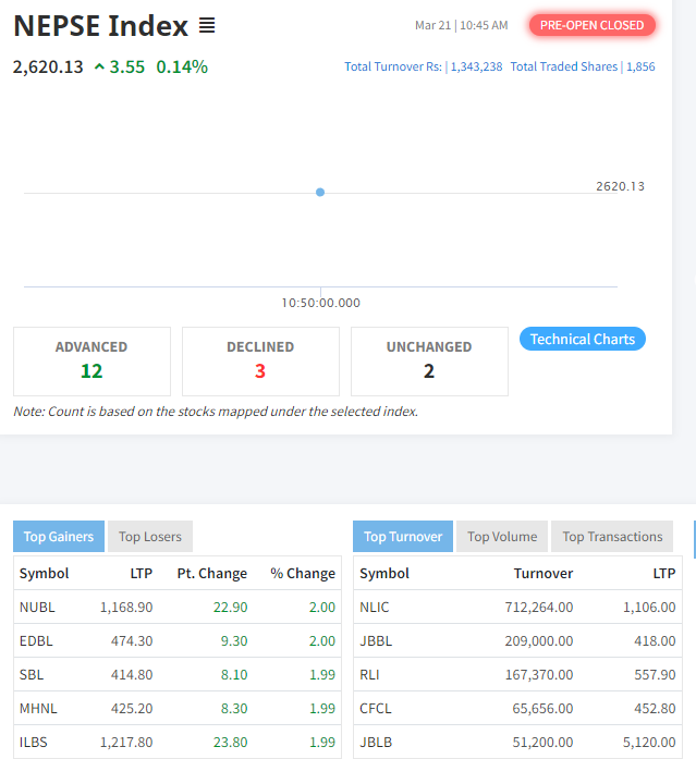 बजार मापन गर्ने सूचक ३.५५ अंकले बढेर परिसूचक २६२०.१३ बिन्दुमा पुगेको छ । १७ कम्पनीको १ हजार ८५६ कित्ता सेयर १३ लाख ४३ हजार २३८ रुपैयाँको सेयर किनबेच भएको छ ।