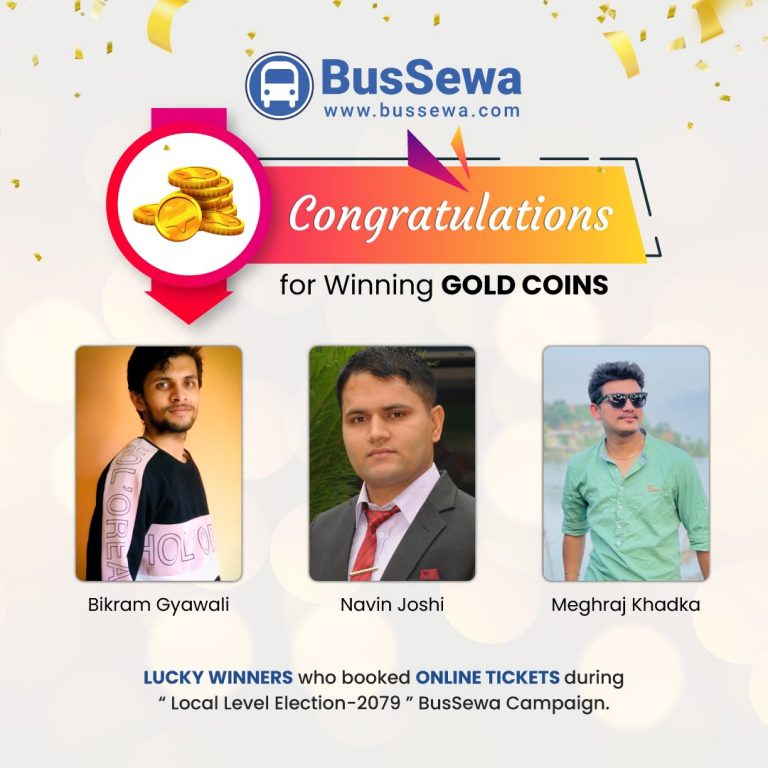 बससेवा डटकमले स्थानीय तहको निर्वाचनलार्ई लक्षित गर्दै सञ्चालन गरेको उपहार योजनाका विजेताले सुनको असर्फी पाएका छन् । अनलाइन मार्फत टिकट बुकिङ्ग गर्ने तनहुँका नविन जोशी, बुटवलका विक्रम ज्ञवाली र चितवनका मेघराज खड्काले सुनको असर्फी जितेका हुन् ।