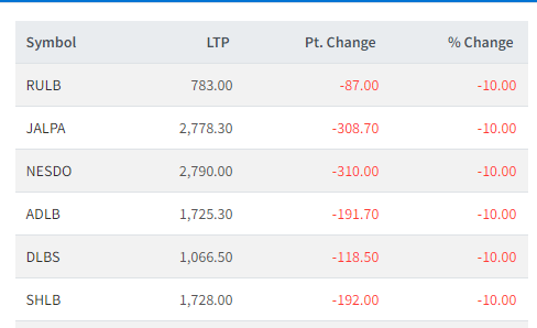 यस्तै राष्ट्र उत्थान लघुवित्त वित्तीय संस्था, जाल्पा सामुदायिक लघुवित्त वित्तीय संस्था, नेष्डो लघुवित्त वित्तीय संस्था, आदर्श लघुवित्त वित्तीय संस्था, धौलागिरी लघुवित्त वित्तीय संस्था, सृजनशिल लघुवित्त वित्तीय संस्थाको सेयर मूल्यका नकारात्मक सर्किट लागेको छ ।