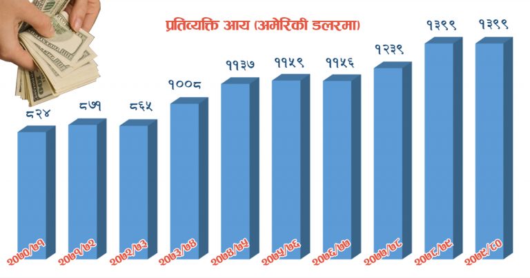 काठमाडौं । बितेको एक दशकमा नेपालीको औसत प्रतिव्यक्ति आय वृद्धिदर अत्यन्तै सुस्त देखिएको छ । राष्ट्रिय तथ्यांक कार्यालयले सार्वजनिक गरेको तथ्यांकअनुसार कुल गार्हस्थ्य उत्पादन (जीडीपी)का आधारमा नेपालीको औसत आय १ हजार ३९९ अमेरिकी डलर छ ।