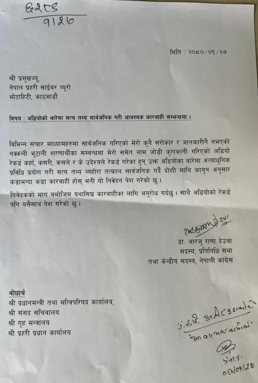 काठमाडौं । नेपाली कांग्रेसकी नेतृ एवं प्रतिनिधि सभा सदस्य डा.आरजु राणा देउवाले नक्कली भुटानी शरणार्थी प्रकरणमा आफ्नो नाम जोडेर आएको अडिओबारे छानबिन गर्न प्रहरी समक्ष निवेदन दिएकी छन् ।
