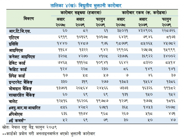 त्यसैगरी, फागुनसम्ममा एटीएमबाट ८१ अर्ब ७३ करोड रुपैयाँ, इसिसिबाट ४ खर्ब ५७ अर्ब ८२ करोड रुपैयाँ, आइपिएसबाट १ खर्ब ५९ अर्ब ९९ करोड रुपैयाँ, कनेक्ट आइपीएसबाट ३ खर्ब ४० अर्ब रुपैयाँ, डेबिट कार्डबाट ८५ अर्ब १४ करोड रुपैयाँ, क्रेडिट कार्डबाट १ अर्ब ४१ करोड र प्रिपेड कार्डबाट ३७ करोड रुपैयाँ विद्युतीय कारोबार भएको उल्लेख गरेको छ ।