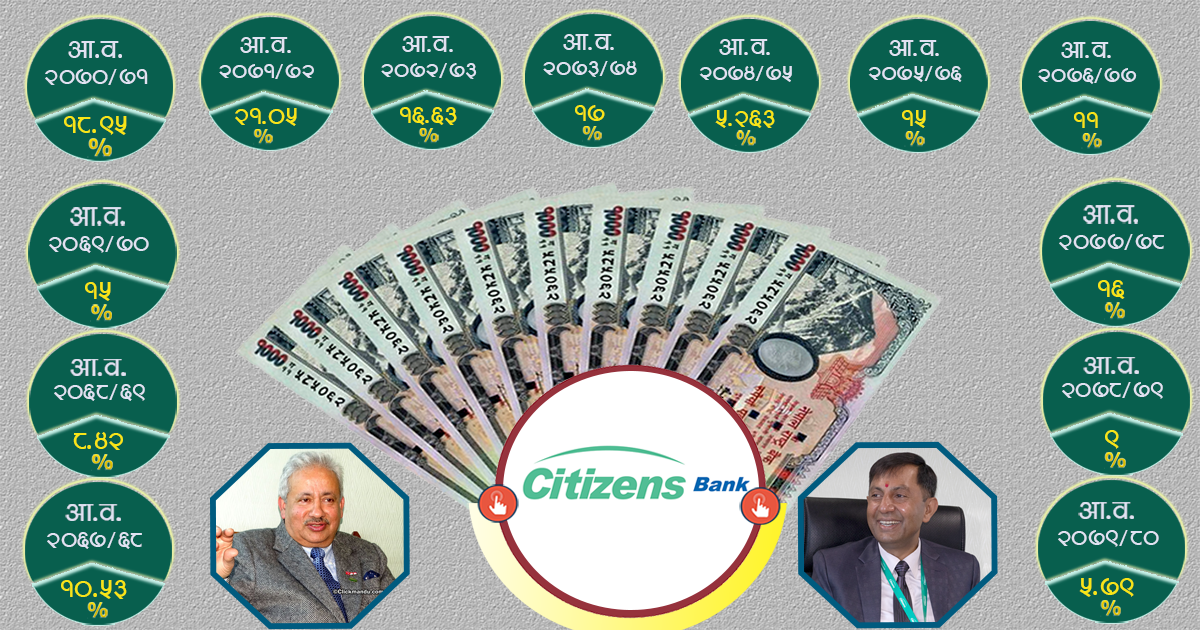 काठमाडौं । सिटिजन्स बैंकले सेयरधनीलाई १३ वर्षको अवधिमा औषतमा १२.११ प्रतिशत लाभांश दिएको छ । बैंकले न्यूनतम ५.२६ प्रतिशतदेखि अधिकतम २१.०५ प्रतिशतसम्म लाभांश दिएको छ ।