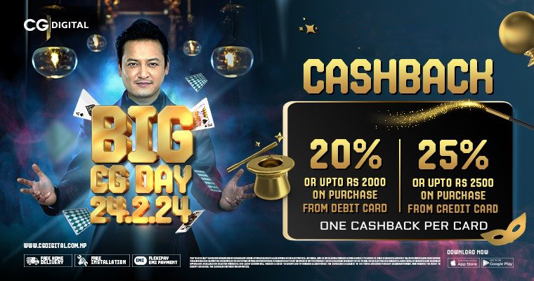 बिग सीजी डे २४.२.२४ मा सीजी ग्रुपअन्तर्गत सीजी इलेक्ट्रोनिक्स सीजी फुड्स, सीजी नेट, सीजी हिल्स्, सीजी एजुकेसन, सीजी हस्पिटालिटी, सीजी सिमेन्ट, सीजी पे र युनाइटेड इन्स्योरेन्स का विभिन्न उत्पादन तथा सेवा–सुविधामा विभिन्न अफर राखिएको छ।